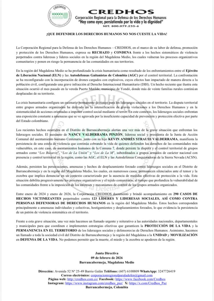 La Corporación Regional para la Defensa de los Derechos Humanos (CREDHOS) alertó sobre el deterioro de la situación de derechos humanos en el Magdalena Medio, en un contexto marcado por la disputa territorial entre grupos armados ilegales. De acuerdo con la organización, los enfrentamientos entre el ELN y las Autodefensas Gaitanistas de Colombia han generado un aumento de amenazas, ataques y desplazamientos forzados, afectando de manera directa a comunidades rurales y urbanas y a quienes ejercen liderazgos sociales y labores de defensa de derechos humanos.