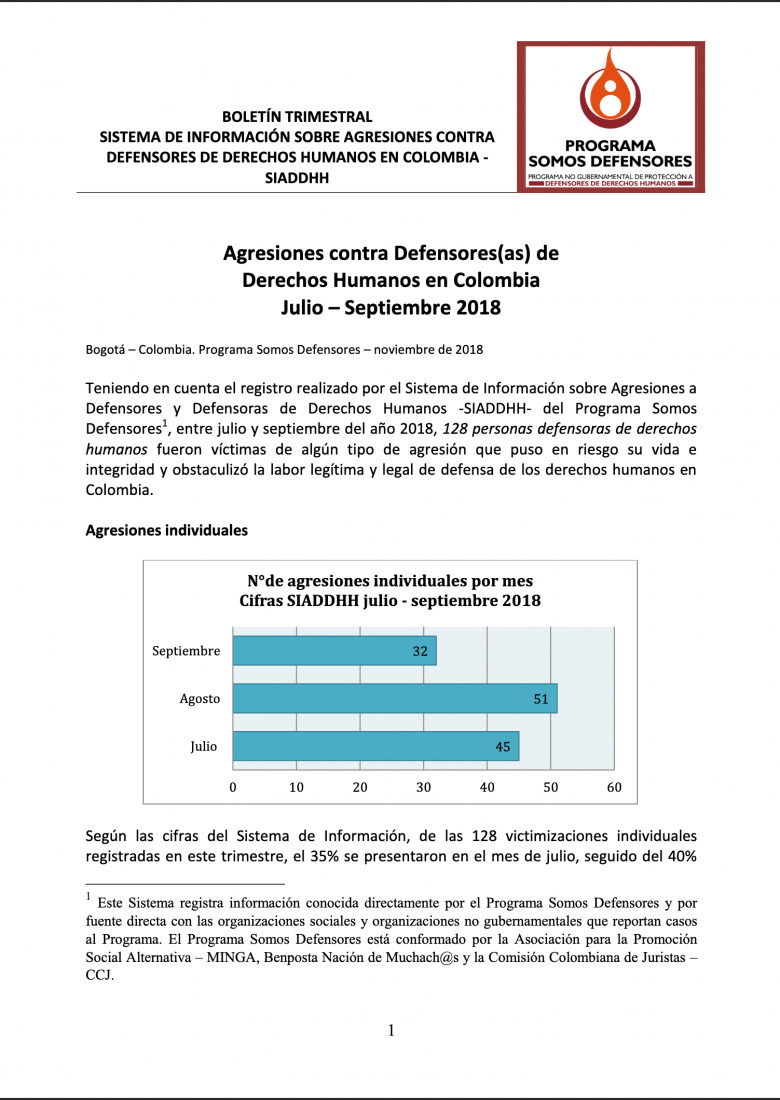 Boletín trimestral SIADDHH julio-septiembre 2018 De Santos a Duque: las cifras del tercer trimestre de 2018 expresan que la situación de indefensión de los liderazgos sociales y personas defensoras de DD.HH., es creciente. Esta situación indica que las garantías para el ejercicio político y social de estos activistas, no existen; sumado a las nuevas dinámicas de violencias y grupos ilegales que actúan a pesar de los altos niveles de militarización. Lo anterior implica además que, la directriz de la legalidad, como componente de la seguridad planteada por el nuevo gobierno, aún no se refleja en la mejoría de los contextos para el ejercicio de las libertades ciudadanas o por lo menos, para los liderazgos sociales. Entre julio y septiembre de 2018, el Sistema de Información de Agresiones contra personas defensoras de DD.HH. en Colombia – SIADDHH, registró un total de 128 agresiones individuales contra defensores(as) discriminadas en: 87 amenazas, 32 asesinatos, cinco atentados, dos detenciones, un caso de hurto de información y uno de judicialización. De estas 128 agresiones, el 74% fueron en contra de defensores y el 26% contra defensoras. En comparación con el mismo periodo del año anterior, el informe denota un aumento en las amenazas, una reducción en el número de atentados y detenciones, y, de manera preocupante, destaca un incremento del 77.7% de los asesinatos, lo cual se traduce en un recrudecimiento de la situación de inseguridad para personas defensoras en cada uno de los territorios. Acerca del incremento de acciones contra la vida e integridad de quienes ejercen liderazgos sociales, se mantiene la tendencia identificada por los informes del Programa desde 2015, manifiesta en homicidios y atentados; tanto los asesinatos aumentaron su ocurrencia en el mismo trimestre (18 casos en 2017 versus 32 en 2018) como el número de atentados descienderon levemente (12 casos en 2017 versus 5 casos en 2018). En cuanto a los agresores, de estos 32 asesinatos, 27 serían presuntamente responsabilidad de Desconocidos, dos casos responsabilidad de las Disidencias FARC, dos de la guerrilla del ELN y uno del EPL. Cauca y Antioquia, continúan siendo los departamentos donde el ejercicio de defensa de los derechos humanos se encuentra altamente perseguido. Con lo anterior, es posible dar cuenta de la necesidad de una política pública que articule de manera efectiva su concepción de legalidad a la realidad de los territorios. Estoimplica la necesidad de que el gobierno nacional sea consciente de la importancia que han tenido las personas defensoras en la consolidación de paz territorial, que no se deje al garete su protección eficaz ni las investigaciones por los crímenes en su contra y, por supuesto, la implementación de mecanismos preventivos para evitar futuras agresiones. Las cifras completas del Sistema de Información de Agresiones contra defensores y defensoras de derechos humanos en Colombia SIADDHH para el periodo julio-septiembre 2018 y otros periodos pueden ser consultados en www.somosdefensores.org Publicado el Martes, 13 Noviembre 2018 – Escrito por Somos Defensores Boletín trimestral de agresiones contra defensores de DD.HH. julio – septiembre 2018.